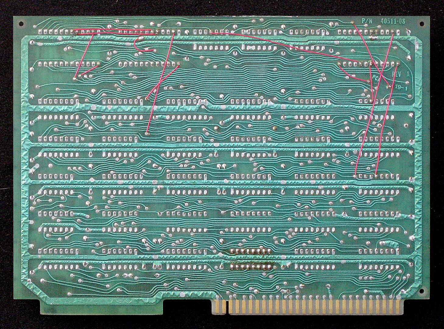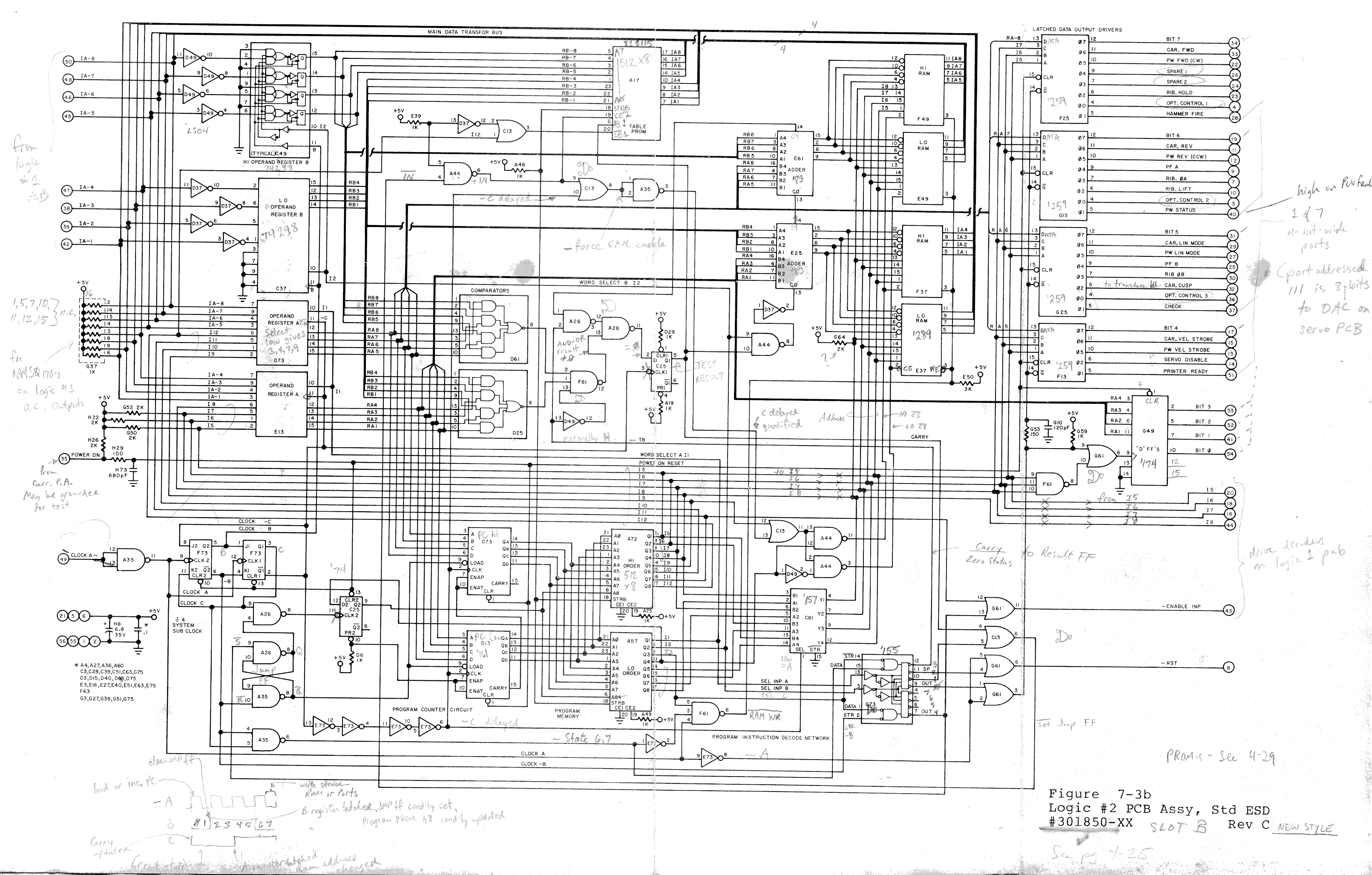 **** UNDER CONSTRUCTION **** This page describes part of the Diablo 1345 Daisy-wheel printer. The digital "brain" in control of the 1345 is not a microprocessor but a proprietary 8-bit engine built out 3 PROM's and a few dozen TTL chips. This elemental computer is a study in contrasts. There are lots of registers (32), but there's no memory as such; registers are the only storage. The instruction set is desperately limited (i.e., only ten instructions); however, the fact that all instructions are single-cycle enables the device to perform adequately. Indeed, this processor and its remarkable software routinely manage motion in all four motors (2 servos & 2 steppers) simultaneously. More amazing yet is that this real-time multitasking is accomplished on a processor with no subroutine capability, no interrupt capability, nor even a Real Time Clock. In the photos of the CPU board you'll notice some wiring mod's. These allow the board to run with 2732A EPROM's instead of the original 82S115 TTL PROM's. I chose 2732A's because they match the 24-pin package of the original chips. The pin assignments differ considerably, but the rewiring has been minimized by swapping certain address lines with others, and likewise shuffling some of the data lines. (Needless to say, the scrambled wiring is functional only if the file written to the EPROM gets pre-scrambled in a complementary fashion.) Besides being easier to develop code with, the EPROM's also have greater capacity than the TTL parts (4096 bytes vs 512). The wire mod's extend the addressable program space from 512 to 2048 bytes; the other 2K of the extra capacity is unused. Architecture and Instruction SetReferring to the Data Path diagram, notice the loop at the top, from the Program Counter (PC) to the Program PROM's to Operand Register A and back to the PC. This loop supports sequential program execution and conditional branching, as follows: at the end of an instruction cycle the PC will usually increment, causing the next sequential instruction to execute. But the JNC is a conditional jump instruction. It will either increment the PC or cause it to load instead, effecting a jump according to a bit field taken out of the 16-bit-wide instruction at the PROM outputs. The jump occurs only if the Carry/Zero Flag (not shown) is clear. (Instructions other than JNC use the bit field for alternative functions: it can supply the instruction with an 8-bit constant or it can address a register or an I/O port.)The rest of the Data Path diagram centers around the Register File. Buses run from the Register File to the Operand A and B registers to the Adder and back. Each instruction cycle includes time for three accesses to the register file: a read of one location, and a read and a write of a second location. The write is optional, and sometimes one or both of the reads produce results that just get discarded. In all cases Operand A and B registers buffer the intermediate results. A typical instruction reads one register, then another, and writes the sum back to the second location. This basic pattern has some useful variations. As already noted, Operand A may be "immediate" data, a program constant. Adding zero (via mux B) is how a move (copy) is accomplished from one register-file location to another. And (besides the 8-Bit Adder) Operand Registers A and B also feed some comparator gates (not shown) for bit testing. Several instructions only use one of the register-file accesses. For example, a word in the file may be sent to an output port, or replaced with data from an input port. The XLAT instruction does a translate ("lookup") operation via tables stored in the Table PROM. (Lookups are used in various ways; for example, to find the hammer intensity associated with any given petal of the print-wheel.) Every instruction op-code uses three bits (I1, I2 and I3; see schematic) to select Operand A, select Operand B, and determine whether a write will occur to the register file. This yields eight basic instructions, one of which has three variants. ********** |