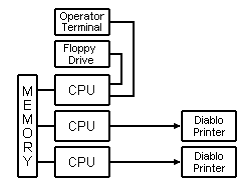 Wescode Description and FunctionThe Wescode 1240M was a bizarre and seemingly backward collection of gear, but despite its quirkiness it was effective, and a customer of mine ran a collection of 1240M's very successfully. The firm printed and bound cheques which, through banks, were sold to the consumer market. Wescode 1240M's were typesetters which printed the account numbers and account-holders' names onto sheets of heavy paper. The sheets were then used as plates, aka: "masters." Mounted on a printing press, they were a cost-effective means of mass-producing the final product — the cheques — using plain paper. The information to be printed arrived on floppy disks produced by another system. The 1240M would read the disk then print the masters using impact printers: specifically, Xerox "Diablo" 1345WP daisy-wheel printers. (I describe these remarkable devices here.) Each 1240M (diagram, left) used two printers: one that printed the customer's name and address, and one that was specially equipped to print the account number — a field requiring machine-readable MICR typeface. The paper master material was fed in a continuous web through the system. Starting from a fanfold supply underneath, the web traveled up to the plain-text printer first, and then up again to the MICR printer above. Due to the delay between printers, at any given time the system would be producing two jobs at once. The entire apparatus was contained in a bulky, oddly shaped fiberglass cabinet that tended to jiggle and shake from the strenuous carriage excursions of the printers. That, plus the machine-gun racket from the printwheel hammers, made a room full of Wescodes truly memorable to behold. The electronics were peculiar as well. The designers had seen fit to deploy a sophisticated, triple-microprocessor system with a shared-memory architecture. The main memory array connected to three individual processor boards, each with a CPU, dedicated I/O and some private ram and EPROM. One CPU handled I/O for the terminal and floppy disk, and the others were for the MICR and Text printers. But the components were ancient! The CPU's were 8080's, and the shared-memory array was 16KBytes (standard). Wescode Service: routine and not-so-routineRoutine service on these systems involved a lot of problems with the floppy drive, and at first we were also plagued by a shoddy wiring harness that (sometimes) supplied DC power to the boards. We had a lot fewer system crashes after I reworked the power distribution. The other main cause of system crashes was electrostatic discharge (ESD). It used to be a serious nuisance, because the operator needs to tweak the setup occasionally, and of course that involves touching the printers. But merely touching a printer could produce an ESD sufficient to crash the software, forcing a reboot — and, worse yet, emptying the pipeline and wasting 4 or 5 half-completed masters. The "fix" was to redirect the chassis ground on the printers so that ESD current didn't have any parallel path through the signal-ground wiring leading back to the computer. When I was done, there was only one path for ESD current, and that was via a dedicated conductor running straight from the printer chassis to the ground on the AC mains cord that powered the entire system. A Memory Upgrade
