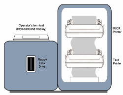 The strangest and by far the most serious malfunction the 1240M's ever presented was one I couldn't effectively resolve except by getting well "outside the box." The problem had to do with the interaction between the human operator and the machine's software. The program and the operator communicated via the 1240M's terminal, which featured a keyboard and a two-line ASCII display. Repeatedly throughout the day, the operator would insert a new floppy disk containing cheque data and then use the terminal to control the printing. But in certain circumstances it was necessary to be quite careful in regard to when you inserted the next disk. Otherwise, it was possible for data from two different disks to get intermingled and printed on the same master. Specifically, it was possible to produce an order of cheques that showed one person's name and address, but the account number would be for someone else's account! It was an absolute nightmare waiting to happen. 100% vigilance by the operators would avoid the problem, but management understandably wanted a more robust defense against disaster. Besides vigilance, another solution would've been to revise the 1240M software. But to do so would've taken an enormous commitment. It was a multiprocessor system, remember, and the program was a spaghetti monolith written in 8080 assembly language. Luckily I was able to offer my client a third option, which I explained carefully and they accepted. It was doable, and it answered their need for something bulletproof. But it was hardly elegant, as you will see. I added a fourth processor to each system — not an 8080, and not connected to the shared memory array. It was a single-chip microcontroller from the Intel MCS-48 family, and it tapped into only three signals on the 1240M: